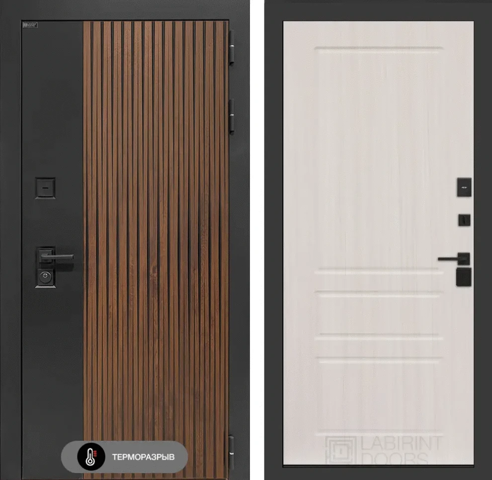 - Черная фурнитура (полимерная): накладки сувальдные со шторкой, накладка под цилиндр, дверная ручка, ночная задвижка, металлический эксцентрик с защитной вставкой.