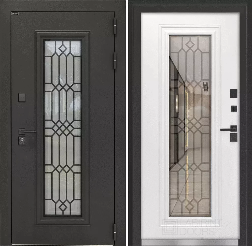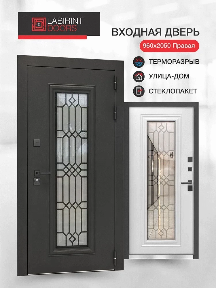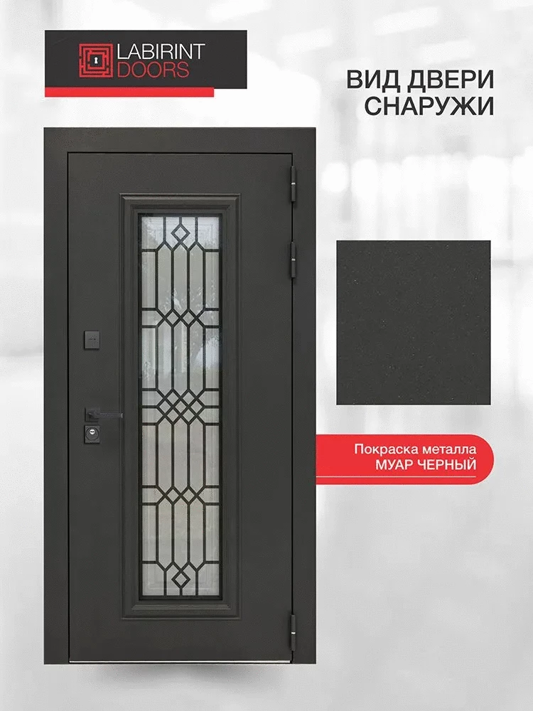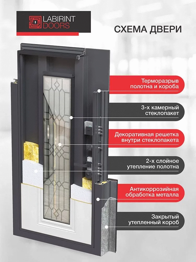 - 3-х камерный стеклопакет 81 мм, снаружи тонированное стекло графит, внутри зеркальное серебро. Лазерная решетка внутри стеклопакета (муар черный)