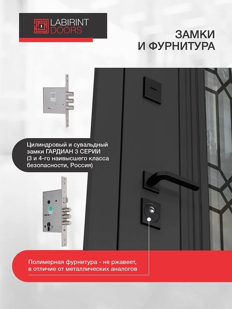 - Черная фурнитура (полимерная): накладки сувальдные со шторкой, накладка под цилиндр, дверная ручка, ночная задвижка, металлический эксцентрик с защитной вставкой.